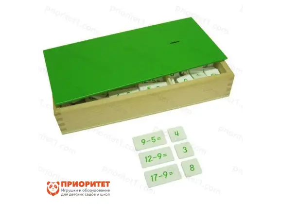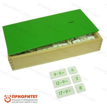 - Деревянный ящик с зелёной крышкой разделён на две неодинаковых части. Там уложены пластмассовые белые фишки с примерами и ответами. В большом отделении лежат фишки с примерами на вычитание, а в маленьком — фишки с ответами (результатами вычитания).