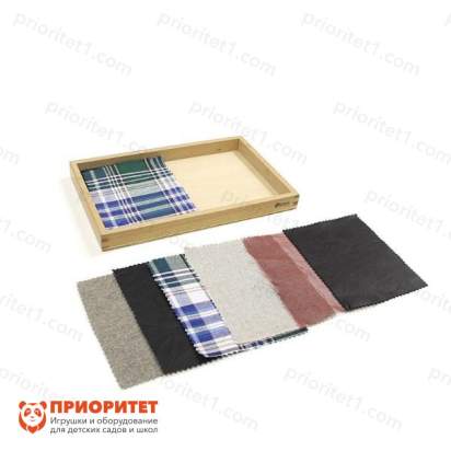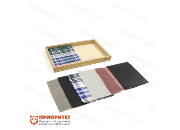 - Представляет собой обрезы ткани разных текстур: хлопок, лен, шелк, шерсть, кожа и искусственная кожа – каждый обрез имеет пару. Ткани лежат на небольшом деревянном подносе: его удобно установить на шкафу, не растеряв материалы и не занимая лишнего пространства.