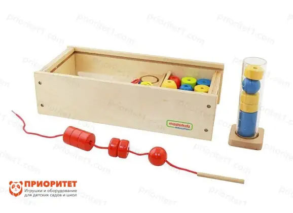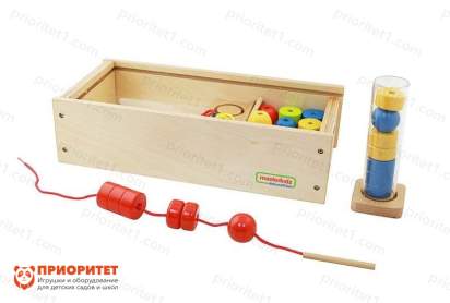 Популярный набор изготовлен из дерева и тканых материалов: веревка сделана из текстиля. Имеются элемент росписи предметов для нанизывания: это шарики, различные геометрические фигуры, фигурки животных и др. (все зависит от комплектации в конкретном случае).