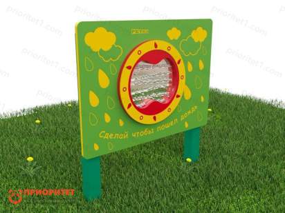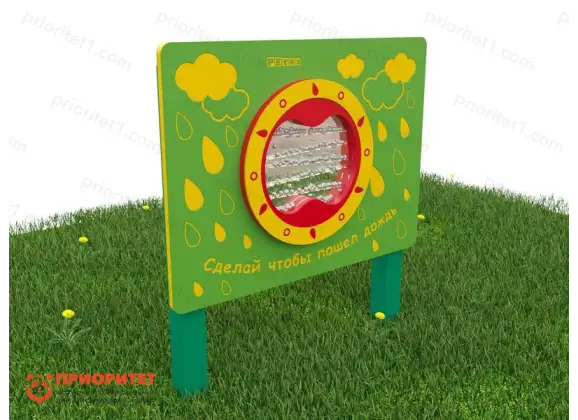 - Игровая зона модуля представляет собой иллюминатор, в котором находятся маленькие шарики из нержавеющей стали — это капли дождя. Через прозрачные акриловые полоски с отверстиями шарики проходят, создавая эффект настоящего дождя. Дети будут вращать иллюминатор, наблюдая за этим удивительным визуальным явлением, а также наслаждаться звуком, который напоминает настоящий дождик.