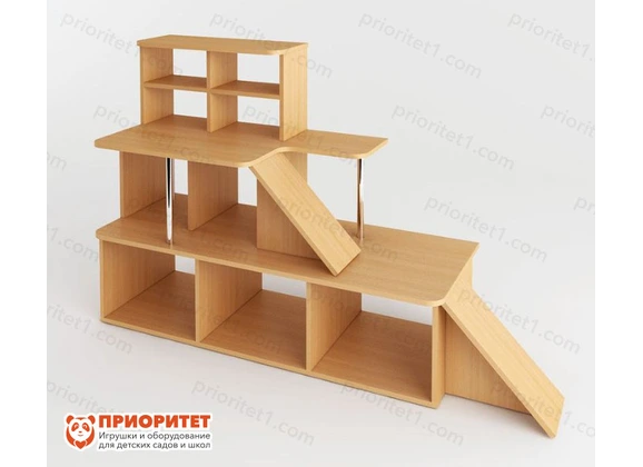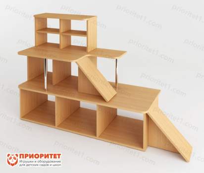 Игровой уголок напоминает многоуровневый стол школьника, единственное и важное отличие от него – горки между уровнями. Благодаря этим горкам малыши могут завозить машинки на свои парковочные места. Уголок дает малышам отличную основу для развития фантазии. Оборудование изготовлено согласно требованиям безопасности маленьких пользователей.