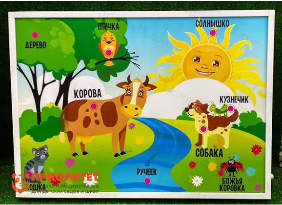 Ребенок видит поляну, на которой находятся животные, насекомые, небесные светила, растения. Каждый объект подписан. Волшебство начинается от прикосновения пальцев к панели. Каждая деталь начинает подсвечиваться, мигать, издавать звуки.