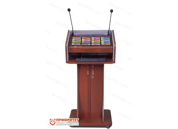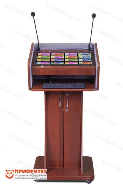 - Трибуна оснащена двумя микрофонами на длинных ножках. Благодаря этому оратор может легко поворачиваться из стороны в сторону, обращаясь к аудитории, при этом его будет хорошо слышно;