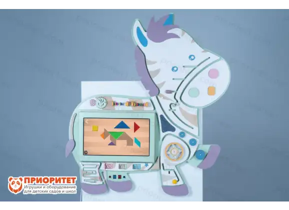 - На центральной части размещена сенсорная интерактивная панель, оснащенная программами по правилам дорожного движения.