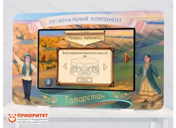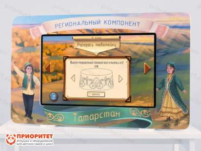Интерактивный комплекс «Региональный компонент Татарстан» поддерживает два языка: татарский и русский. Встроенное уникальное программное обеспечение позволит детям выполнять задания на логику, внимание. Дети развивают мелкую моторику, сообразительность, память в легкой игровой форме.