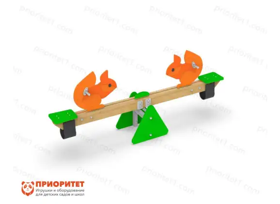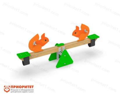 - По краям качалки находятся сидячие места (2 шт.) из влагостойкой фанеры. Перед каждым установлены ручки (оцинкованный металл), чтобы ребенок мог крепко держаться при качании на балансире. Ручки украшены фанерными ярко-оранжевыми белочками.