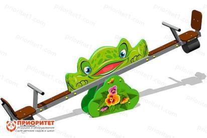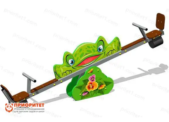 Качалка-балансир с крупным декором в виде большой лягушки оживит детскую игровую площадку и разнообразит отдых новыми ощущениями. Катание на ней основано на принципе перевеса. Дети с примерно одинаковой массой, отталкиваясь от земли ногами, поочередно поднимаются вертикально вверх и опускаются вниз.