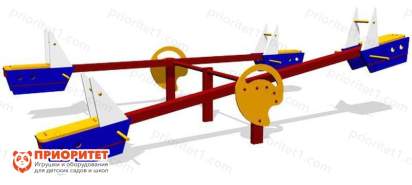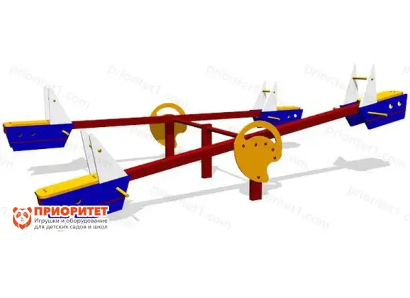 Четверо моряков могут отправиться в кругосветное путешествие, не выходя за пределы детской площадки! Дети занимают места на корабликах, отталкиваются ногами от земли и приводят качели в движение. Балансировать следует ногами, не наклоняясь телом и головой. Основа каждого сиденья оформлена в виде парусника с синими стенками и желтыми выпирающими вставками – ручками. Ребенок любого роста дотянется до ручек.