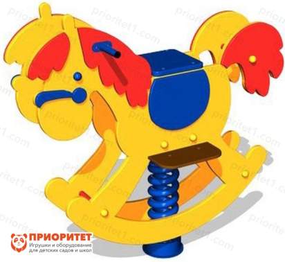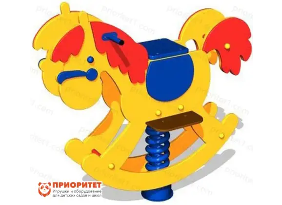 Качалка сделана в виде лошадки, на спине которой находится сиденье. Конструкция располагается на пружинном блоке, при помощи которого происходит раскачивание.