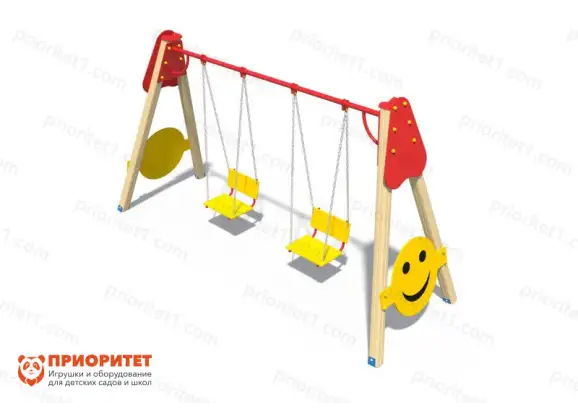 Детские деревянные качели, рассчитанные на два места. Украшены по бокам веселыми шариками-смайликами. Уличный игровой «инвентарь», предназначенный для веселого времяпрепровождения малышей. Оснащены спортивными элементами и декором. Подходят для детей от 3-х лет. Ребятам помладше рекомендуется находиться на качелях под присмотром взрослых. Изделие поможет гармонично дополнить спортивно-развлекательные уличные комплексы. Подарит массу положительных эмоций. Способствует физическому развитию детей.