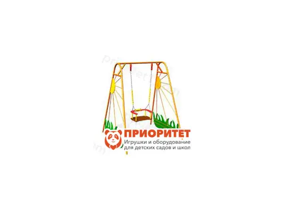 Качели изображают луг, на котором растут красные цветы. Сочетание цветов помогает ребенку воспринимать качели, как картинку из книг или игр. Это развивает воображение и прививает любовь к предмету. Качели снабжены креслом. Оно имеет спинку и подлокотники. Это обеспечивает безопасность ребенка во время пользования предметом.
