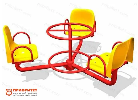 Карусель предназначена для оборудования детской площадки и позволяет малышам найти интересное занятие во время прогулки. Благодаря наличию 3-х сидений дети могут дружно заниматься одним делом, крутить колесо и наслаждаться непрерывным движением, словно в хороводе. Карусель не наносит вреда здоровью малышей при соблюдении техники безопасности.