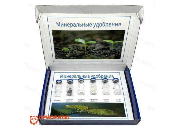 Коллекция включает в себя 12 видов наиболее распространенных минеральных удобрений, каждый из которых представляет собой отдельный образец для демонстрации в классе. Все удобрения подробно описаны с указанием их химического состава и классификации. Каждый образец удобрения помещен в колбу с плотно закрывающейся крышкой, что предотвращает случайные утечки и сохраняет образцы в идеальном состоянии. Упаковка — это прочная картонная коробка с ложементами, дополнительно защищенная термоусадочной пленкой для гарантии сохранности материала при транспортировке и хранении.