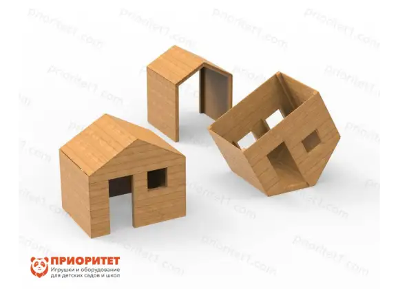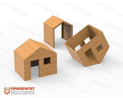 Комплекс игровых домиков для детской площадки Wood – это игровое оборудование, предназначенное для уличных игр с детьми. Представляет собой комплект из нескольких деревянных домиков разной формы: проем, классический домик и дизайнерская перевернутая модель, которые дети могут использовать в сюжетно-ролевых играх и обустраивать быт.