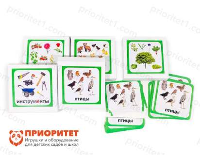 - В составе набора данной серии 5 комплектов карточек с изображениями птиц, растений, инструментов, животных, детенышей;