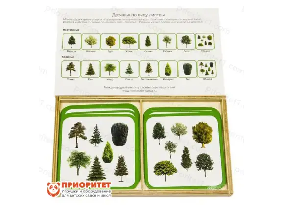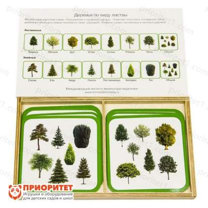 - В данном комплекте есть 14 карт с рисунками деревьев: половина из них относится к лиственным видам, другая – к хвойным. Цель малыша – разделить деревья по видам, опираясь на характерные особенности. После чего проверить себя на специальной карте, изображающей все деревья одного вида.