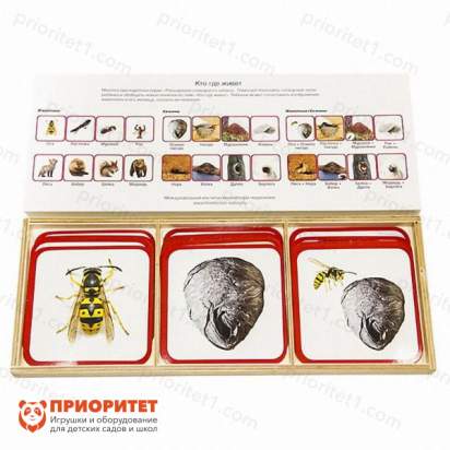 Карточкам с реалистичным и точным изображением: животных осы, ласточки, муравья, рака, лисы, бобра, белки, медведя и мест их обитания. Ребенок легко запоминает внешний вид животного, его жилища и их название. Для проверки используются карточки, на которых нарисовано животное и его дом. Карточки хранятся в специальном подносе, разделенном на 3 одинаковых ячейки. Названия животных и их изображения указаны на картонной коробке.