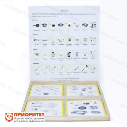 - Разбирая карточки по группам, малыши учатся различать посуду по назначению: кухонная, столовая, чайная и приборы. В процессе занятия дети знакомятся с описанием предметов, находят схожие и отличительные черты.