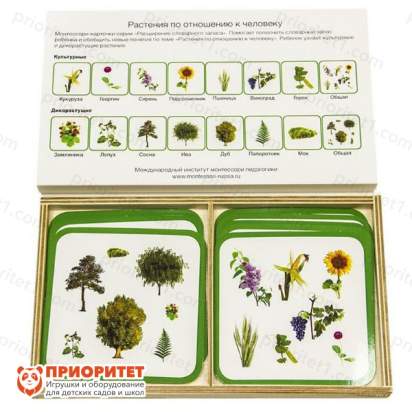 - Представляет собой набор карт с изображениями 14 растений: половина из них относится к культурным видам, другая – к дикорастущим. Задача малыша – разделить растения по видам, а после проверить решение по специальной карте, где изображены все растения одного вида.