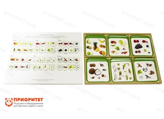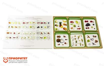 - Комплект включает 42 иллюстрированные карты, разделенные на шесть видов съедобных растений: овощи, фрукты, ягоды, орехи, злаки и пряности. Целью малыша является запомнить все данные растения и научиться делить их по характерным группам. В качестве подсказки есть проверочная карта со всеми культурами.