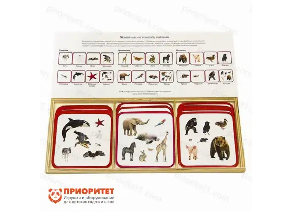 Используя карточки Монтессори в процессе обучения, педагог должен помочь ребенку выучить названия животных, узнать их способ питания и научить классифицировать животных по этому признаку.