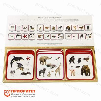 Для занятий доступно 18 ламинированных карточек с качественными, точными и реалистичными рисунками животных, плюс 3 проверочные карточки со сводной картинкой всех животных 1 типа. Карточки хранятся на специальном деревянном подносе. Названия всех животных написаны на упаковке.