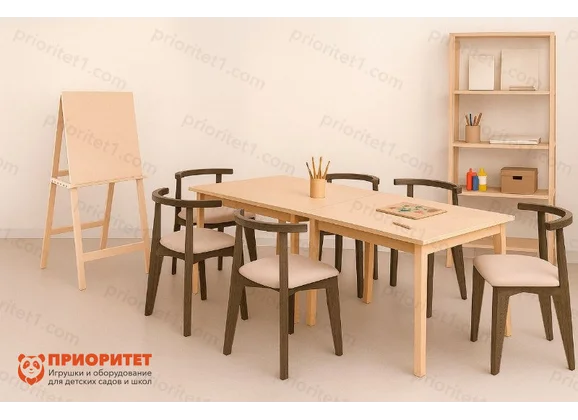 - 6 стульев «Контур» — эргономичные стулья из прочной фанеры с мягким сиденьем и изогнутой спинкой для комфортной посадки;