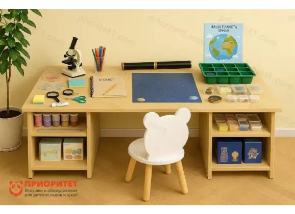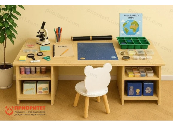 Стол «Исследователь» — это полноценная мини-лаборатория для познавательной и исследовательской деятельности дошкольников. Он создан для детских садов, центров развития, инклюзивных групп и кабинетов познания мира, где каждый ребёнок может почувствовать себя настоящим учёным, археологом или астрономом. Стол наполнен наборами для опытов по различным направлением знаний.