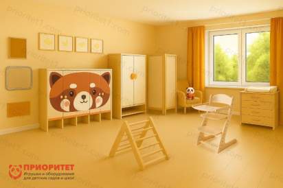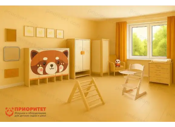 - (1.14.2.2.6). Система хранения вещей воспитанников секционная. Детский шкаф-раздевалка «Красная пандочка». Каждая из пяти секций оснащена местом для верхней одежды и обуви, имеет место для сидения. Фасад оформлен в виде дружелюбной мордочки красной панды, что создаёт позитивный эмоциональный настрой. Шкаф помогает детям учиться самостоятельности, а яркий дизайн формирует дружелюбную атмосферу.