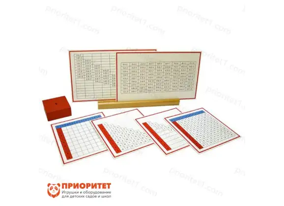 В комплекте имеют 2 набора карточек. На одних карточках написаны примеры, на других – таблица из вертикальных и горизонтальных полос. В первом комплекте с примерами всего 2 карточки. Одна из них заполнена полностью, на другой некоторые примеры отсутствуют. После изучения первой карточки ребенок, освоивший логическое построение, должен заполнить пробелы во второй. Другой набор состоит из 4-х карточек. Первая содержит синюю горизонтальную полосу с числами от 0 до 9 и вертикальную красную полосу с числами от 1 до 9. Белое поле между цветными полосами поделено на клетки, в каждой из которых написано число, обозначающее сумму двух отдельных чисел из красной и синей полос. Например: в красной полосе нужно найти число 5, а в синей – число 7. От 5 нужно провести пальцем по горизонтали вправо, а от 7 – по вертикали вниз до тех пор, пока пальцы не встретятся на числе 12. Следующие 2 карточки содержат неполные наборы чисел. Ребенку необходимо дополнить таблицу, вставив отсутствующие значения. На последней карточке есть только синяя и красная полосы с числами и поле, поделенное на квадраты.