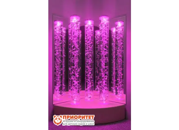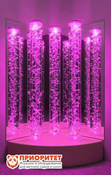 Уголок для сенсорной комнаты представляет собой комплект из 3х воздушно-пузырьковых колонн на мягкой подставке. По бокам расположены большие зеркала, отражающие колонны и создающие эффект бесконечности. Мягкую подставку можно использовать в качестве сиденья. Все необходимые для работы элементы, компрессоры и провода спрятаны под подставкой, что обеспечивает их сохранность и ограничивает возможность любопытным детям нанести ущерб оборудованию или собственному здоровью. Уголок рекомендован к использованию в сенсорных комнатах, зон релаксации или в кабинете психолога.