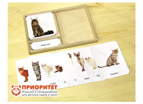 - комплект трёхчастных карточек с изображением 20 пород кошек (печатные буквы);