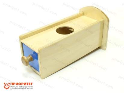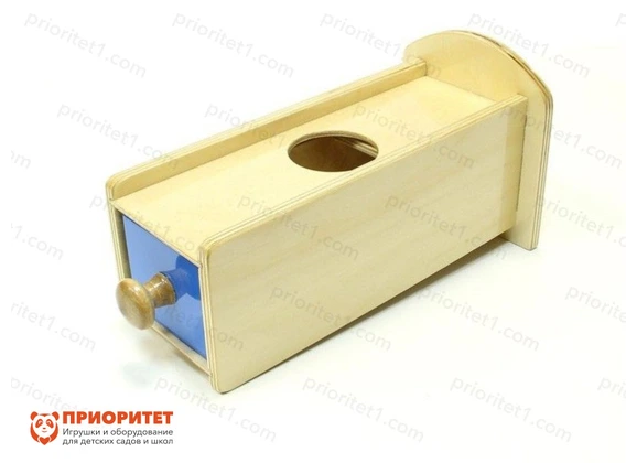 - Представляет собой тренажер в виде коробочки: сверху имеет круглую прорезь для того, чтобы закидывать мячик, а сбоку – выдвижной ящик. Задача ребенка – положить мячик внутрь коробки и вытащить его через ящик.