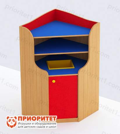 Детская кухня представляет собой модуль с мойкой, двумя полочками и шкафчиком. Он имеет угловую форму, такую кухню можно легко разместить в игровой комнате любого размера.