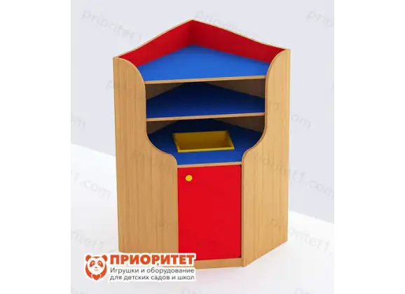 Детская кухня представляет собой угловую секцию, в которой расположена раковина, шкафчик и две полочки, на которые можно поставить игрушечную посуду и припасы.