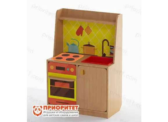Кухня компактная и яркая, она подойдёт для обустройства игровой комнаты в детском саду и порадует малыша дома.