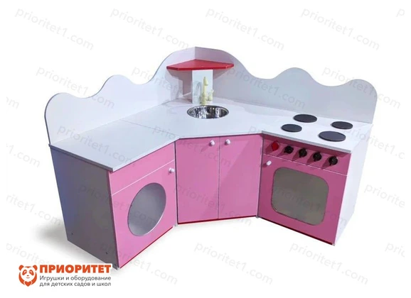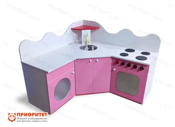 Угловая детская кухня — это функциональный предмет мебели небольших размеров. Предмет имитирует рабочую зону, которая есть в каждом доме. Конструкция полностью соответствует требованиям ФГОС и является безопасной для дошкольников. В этой модели предусмотрена имитация важных элементов: стиральная машина, раковина, газовая плита, духовка и столешница. Нижние дверцы открываются, позволяя максимально правдоподобно использовать игровую мебель.
