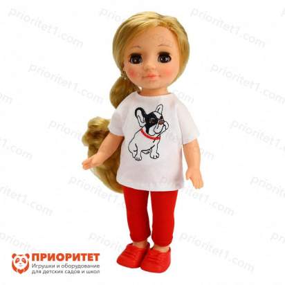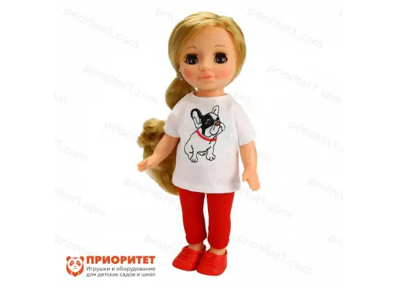 Ася одета в тунику с вышивкой «Бульдог», обтягивающие лосины и мокасины. Все элементы наряда просто снимаются, так как застегнуты на удобную контактную ленту. Игры с переодеванием разнообразят сюжетные игры, развивают моторику ребенка и формируют творческое воображение.