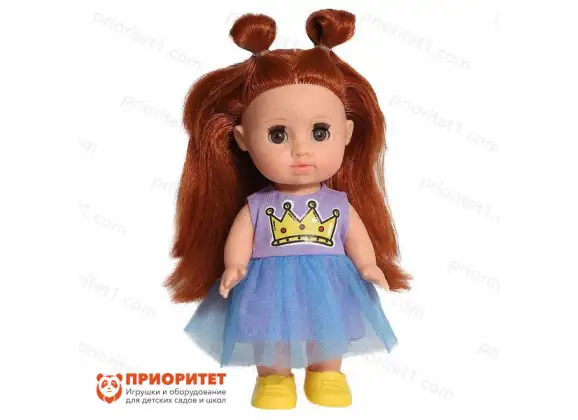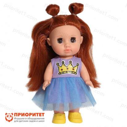 - Одета кукла в яркое платье. Верх фиолетовый с принтом в виде короны, низ – пышная фатиновая юбка.
