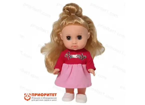 - Одета кукла в яркое платье. Верх красный с принтом «Принцесса», юбка – нежно-розовая, клеш.