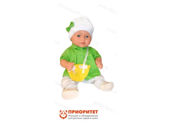 - У куклы есть один комплект одежды, состоящий из зеленого платья с кармашком-сумочкой, шапочки, ползунков и туфель. Одежда легко снимается и надевается, когда ребенок хочет искупать ее.
