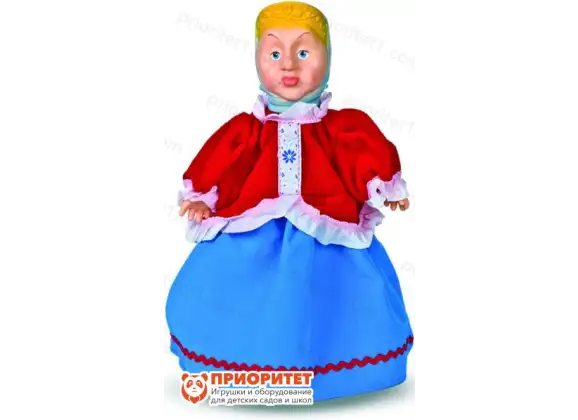Голова мачехи, как и других подобных кукол, выполнена из ПВХ-пластизола, наряд женщины в виде народного сарафана, а сверху объемный кафтан. В рукавах вставлены ладоши из мягкого винила, чтобы образ приобрел реалистичности.