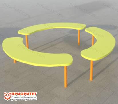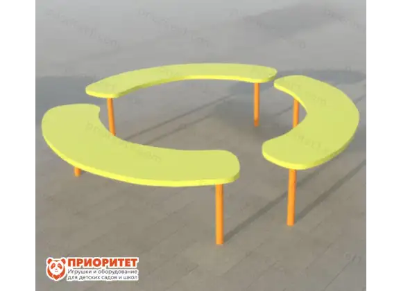 - Скамейки имеют полукруглую форму, поэтому их можно поставить в круг. Фанерное сидение плотно крепится на металлических ножках.