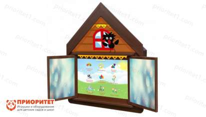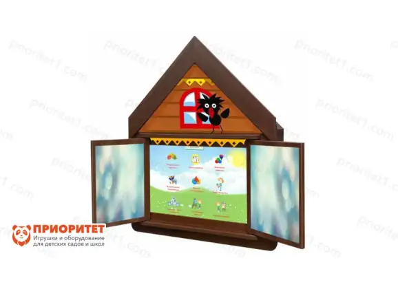 Логопедический комплекс "Домик Антошки" – навесная интерактивная панель. Дизайн выполнен в виде теремка с открывающимися окошками. Верный помощник – черный птенчик, который украшает основную панель комплекса.