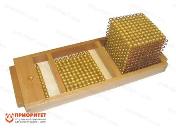 Материал для введения количеств состоит из деревянного подноса, на котором сложены бусины золотого цвета. Всего их 1000 и они составляют куб. Одна сотня составляет квадрат из бусин, десяток – ряд в нем.