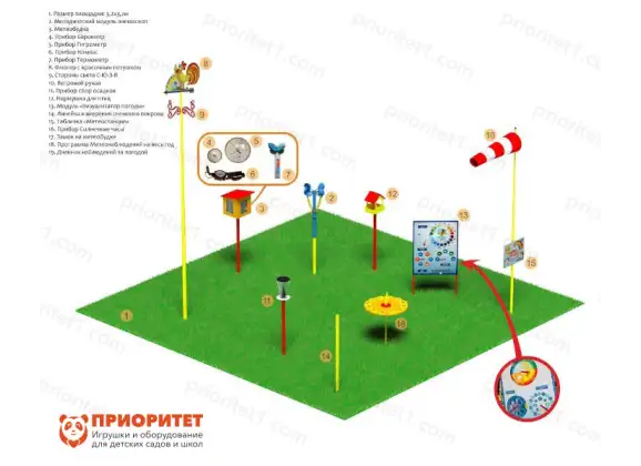 Метеорологическая площадка «Эконом №2» – это расширенный набор инструментов для определения погоды маленьким метеорологом. 19 различных предметов ответят на любые вопросы малыша даже те, о которых он сам не подозревает. От №1 отличается другим обучающим стендом.