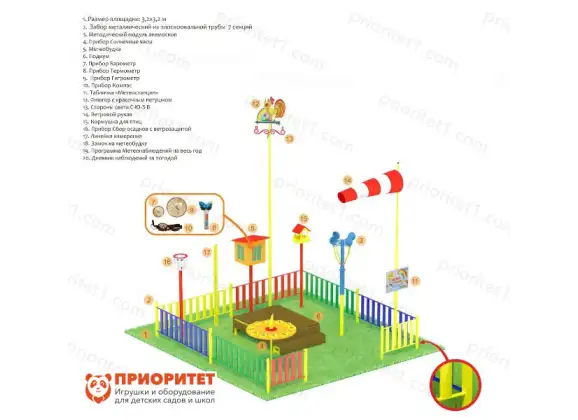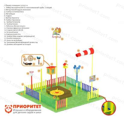 Метеорологическая площадка «Оптима ПЛЮС» для установки под открытым небом. Познакомит ребенка или коллектив детей с окружающим миром, явлениями природы, сторонами света. Научит правильно определять «север» при помощи компаса. Яркие цвета, в которые окрашен комплекс обязательно обратят на себя внимание маленьких почемучек.