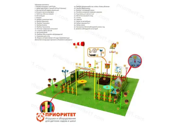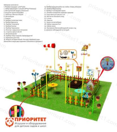 Метеорологическая площадка «Премиум» будет отлично смотреться во дворе детского учреждения. Красочное оформление привлечет внимание не только детей. А те, кто не проявлял активности на занятиях по окружающему миру, одумаются и станут отъявленными отличниками по предметам, связанным с природой. Все оборудование полностью безопасно. Не используются токсичные лакокрасочные материалы.