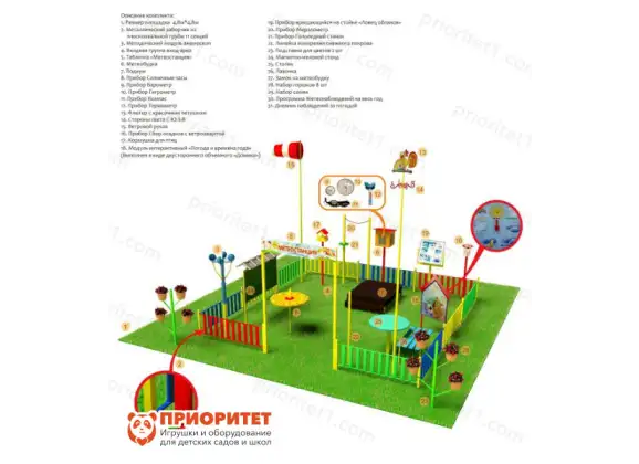 Метеорологическая площадка «Премиум ПЛЮС» для учебно-игровых занятий в детских учреждениях на свежем воздухе. Это могут быть детские сады, школы, учреждения дополнительного образования, а также реабилитационные и коррекционные центры. Яркие краски, которыми раскрашен комплекс заманят в свои объятия даже тех детей, которые не питают большой любви к обучению.