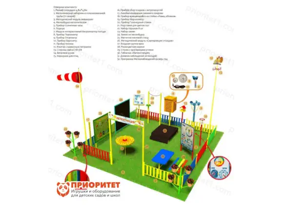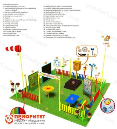 Метеорологическая площадка «ПРО ПЛЮС» (металлическая) для установки и занятий в детских дошкольных учреждениях и младшей школе. Развивает любовь к природе, а также бережное отношение к окружающему миру. Яркие краски не оставят равнодушным ни одного малыша. Площадка поможет научиться проводить опыты, работать с приборами, делать заключения.